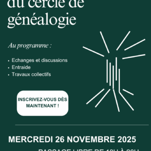 Le cercle de généalogie fait son retour le mercredi 26 novembre !Grands débutants et amateurs chevronnés, vous êtes les bienvenus pour échanger et partager autour de vos envies et de vos recherches.Club gratuit. Passage libre de 18h à 20h ...