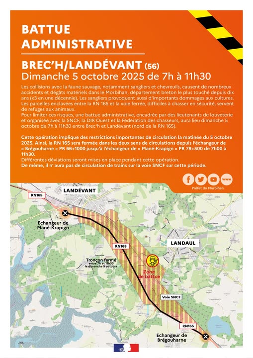 Organisation d’une battue administrative le dimanche 5 octobre 2025 – Secteur Brech / Landévant