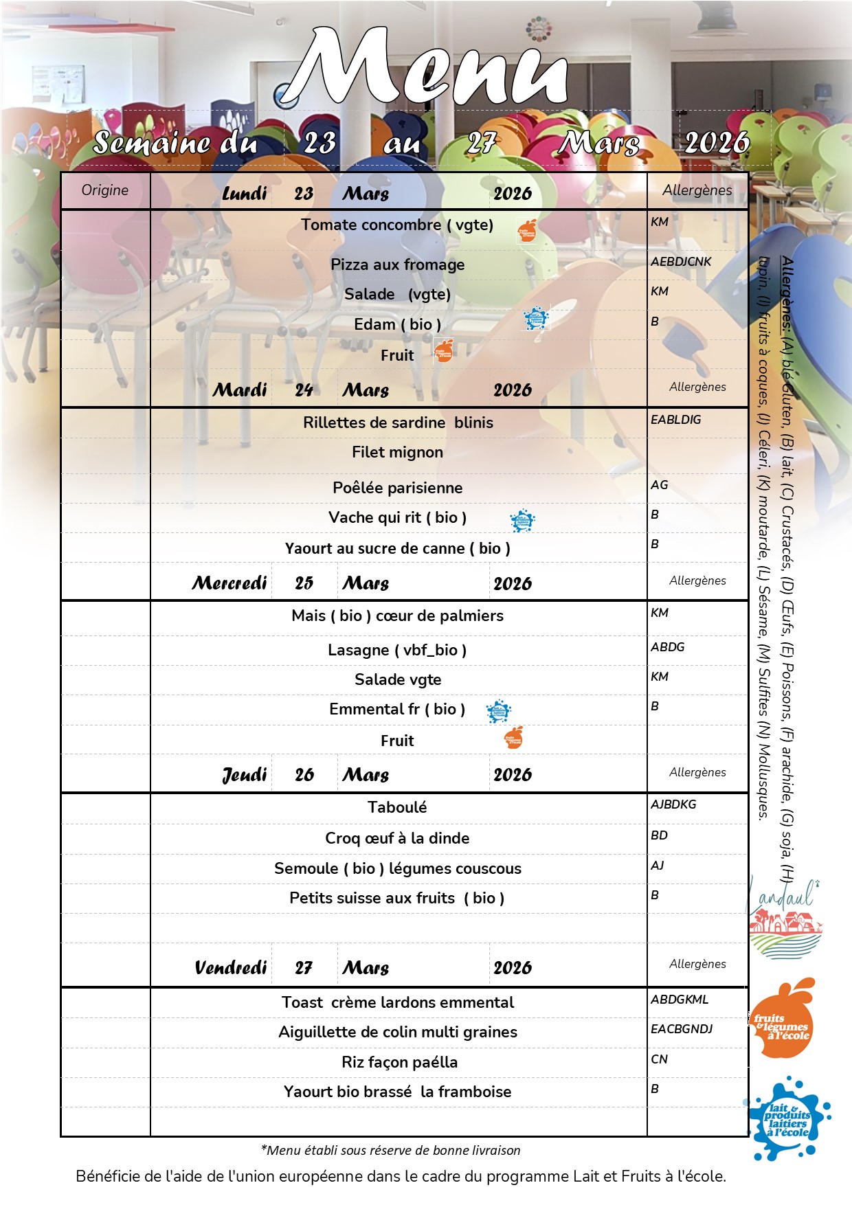 Les menus de la semaine sont consultables ci-contre à droite. Ils sont aussi affichés sur le tableau d’affichage de la mairie.