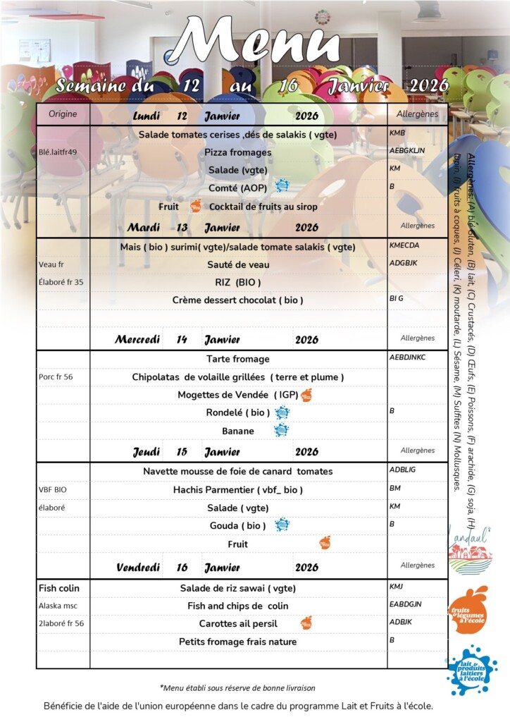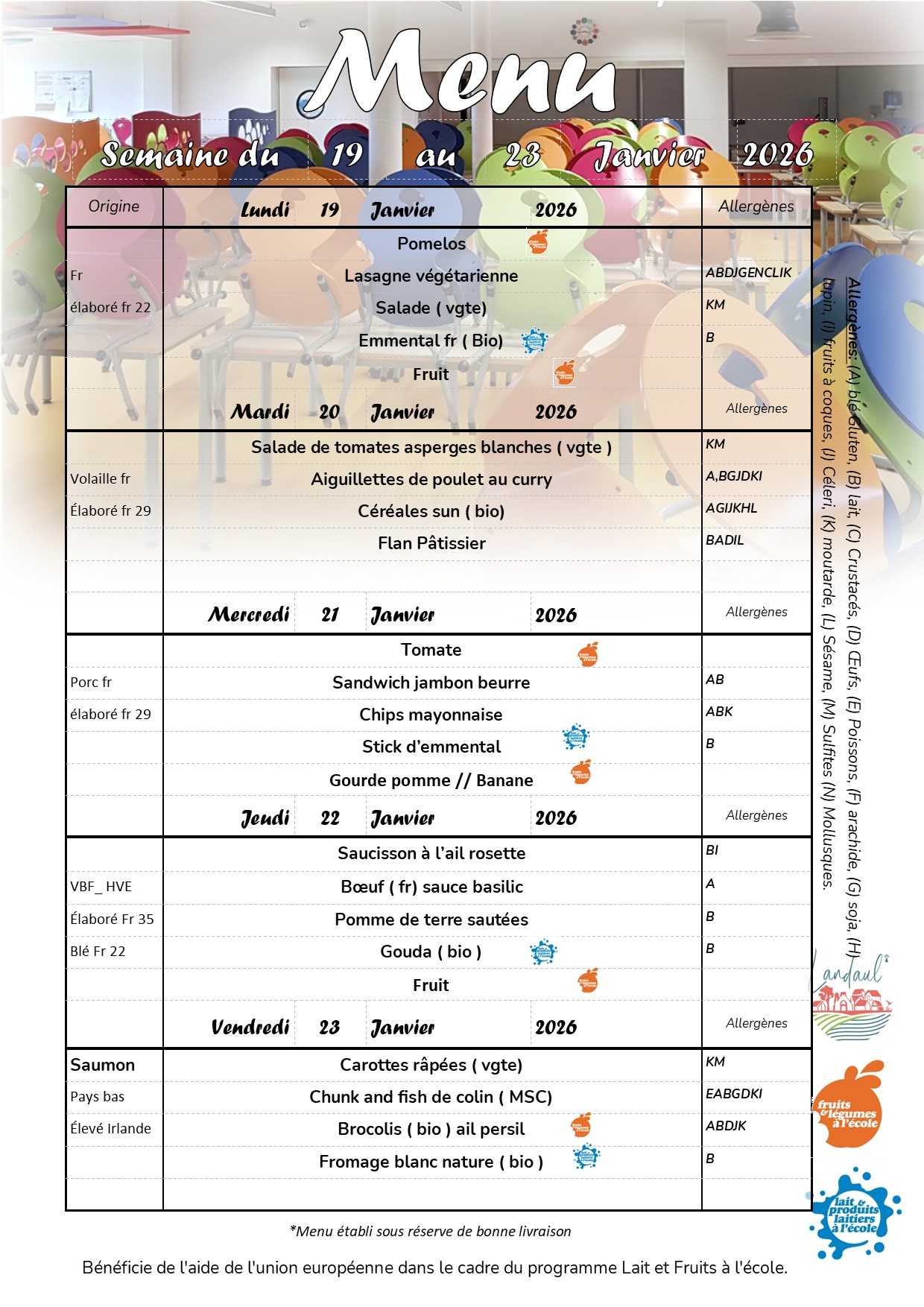 Les menus de la semaine sont consultables ci-dessous. Ils sont aussi affichés sur le tableau d’affichage de la mairie.